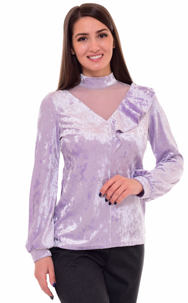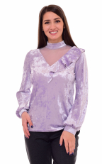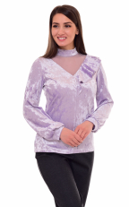Джемпер женский из бархата. Горловина стойка. Рукава длинные на манжете. Полуприталенного силуэта. Вставка из сетки в "V" образный вырез и осиметричная рюша придают элегантности джемперу. Длина изделия : 44 р. - 62 см, 46 р. - 63 см, 48 р. - 64 см, 50 р.- 65 см, 52 р. - 66 см, 54 р.- 67 см, 56 р. - 68 см.