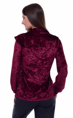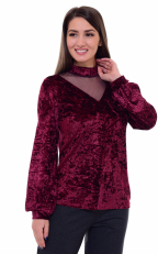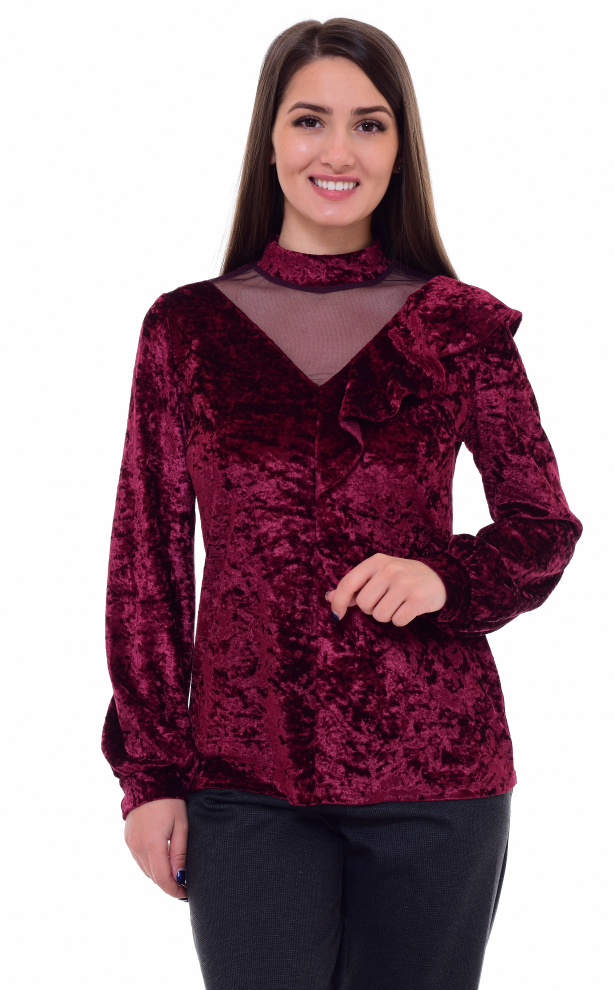 Джемпер женский из бархата. Горловина стойка. Рукава длинные на манжете. Полуприталенного силуэта. Вставка из сетки в "V" образный вырез и осиметричная рюша придают элегантности джемперу. Длина изделия : 44 р. - 62 см, 46 р. - 63 см, 48 р. - 64 см, 50 р.- 65 см, 52 р. - 66 см, 54 р.- 67 см, 56 р. - 68 см.