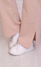 Женский костюм из футера 2-х нитки. Кардиган застегивается на пуговицы, V-образная горловина, рукав со спущенной проймой, длинный , на манжете, низ кардигана на поясе. Брюки свободного кроя, слегка расклешенные к низу, двумя разрезами по бокам. Посадка брюк высокая, пояс на широкой резинке со шнуром, в боковых швах карманы. Длина кардигана по спинке: 42-67 см, 44-68 см, 46-69 см, 48-70 см, 50-71 см, 52-72 см, 54-73 см, 56-73 см. Длина брюк по боковому шву: 42-104 см, 44-105 см, 46-106 см, 48-107 см, 50-108 см, 52-109 см, 54-110 см, 56-110 см. Длина брюк по шаговому шву: 42-80 см, 44-80 см, 46-80 см, 48-80 см, 50-80 см, 52-80 см, 54-80 см, 56-80 см.