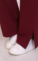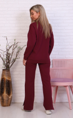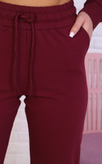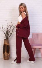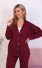 Женский костюм из футера 2-х нитки. Кардиган застегивается на пуговицы, V-образная горловина, рукав со спущенной проймой, длинный , на манжете, низ кардигана на поясе. Брюки свободного кроя, слегка расклешенные к низу, двумя разрезами по бокам. Посадка брюк высокая, пояс на широкой резинке со шнуром, в боковых швах карманы. Длина кардигана по спинке: 42-67 см, 44-68 см, 46-69 см, 48-70 см, 50-71 см, 52-72 см, 54-73 см, 56-73 см. Длина брюк по боковому шву: 42-104 см, 44-105 см, 46-106 см, 48-107 см, 50-108 см, 52-109 см, 54-110 см, 56-110 см. Длина брюк по шаговому шву: 42-80 см, 44-80 см, 46-80 см, 48-80 см, 50-80 см, 52-80 см, 54-80 см, 56-80 см.