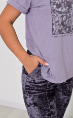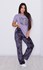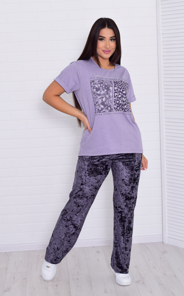 Костюм женский футболка свободного кроя со спущенной проймой , по бокам разрезы, горловина круглая, на полочке стильный принт. Брюки из велюра прямого кроя, спереди застрочена стрелка, двумя боковыми карманами, пояс на резинке со шнуром. Длина футболки: 42-62 см, 44-63 см, 46-64 см, 48-65 см, 50-66 см, 52-67 см, 54-68 см, 56-69 см. Длина брюк по боковому шву: 42-107 см, 44-107 см, 46-107 см, 48-108 см, 50-109 см, 52-110 см, 54-111 см, 56-112 см. Длина брюк по шаговому шву: 42-81 см, 44-80 см, 46-79 см, 48-80 см, 50-81 см, 52-82 см, 54-82 см, 56-82 см