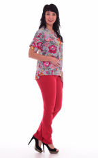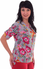 Туника свободного кроя. По горловине прилегающая стойка, застежка на пуговицы. Рукав короткий, по бокам туники разрезы. Отделочные клапана застегиваются на пуговицы. Длина туники по спинке: 44-66 см, 46-67 см, 48-69 см, 50-70 см, 52-72 см, 54-74 см. Уход: бережная стирка при 30 градусах.