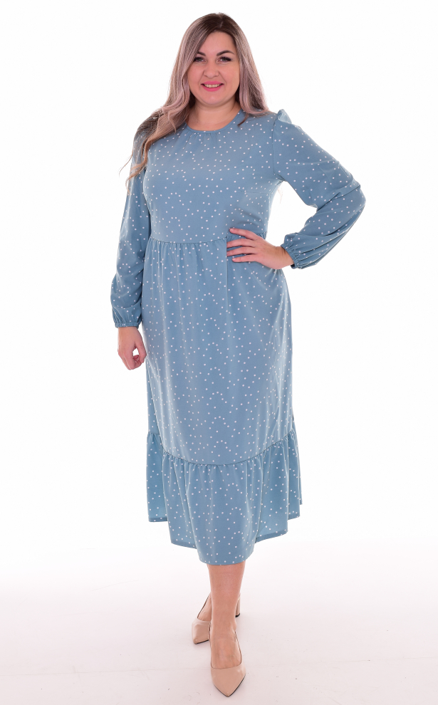 Платье свободного кроя в длине миди, А-силуэт в расцветке мелкий горошек. Горловина круглая, рукав длинный- фонарик, по окату рукава и низ рукава присборен. По низу платья широкая оборка. При желании можно к платью подобрать пояс и подчеркнуть линию талии. Ткань шелковистая, очень приятная к телу. Длина платья: 46-128 см, 48-129 см, 50-130 см, 52-131 см, 54-132 см, 56-133 см. Длина рукава: 46-63 см, 48-63 см, 50-63 см, 52-64 см, 54-64 см, 56-64 см.